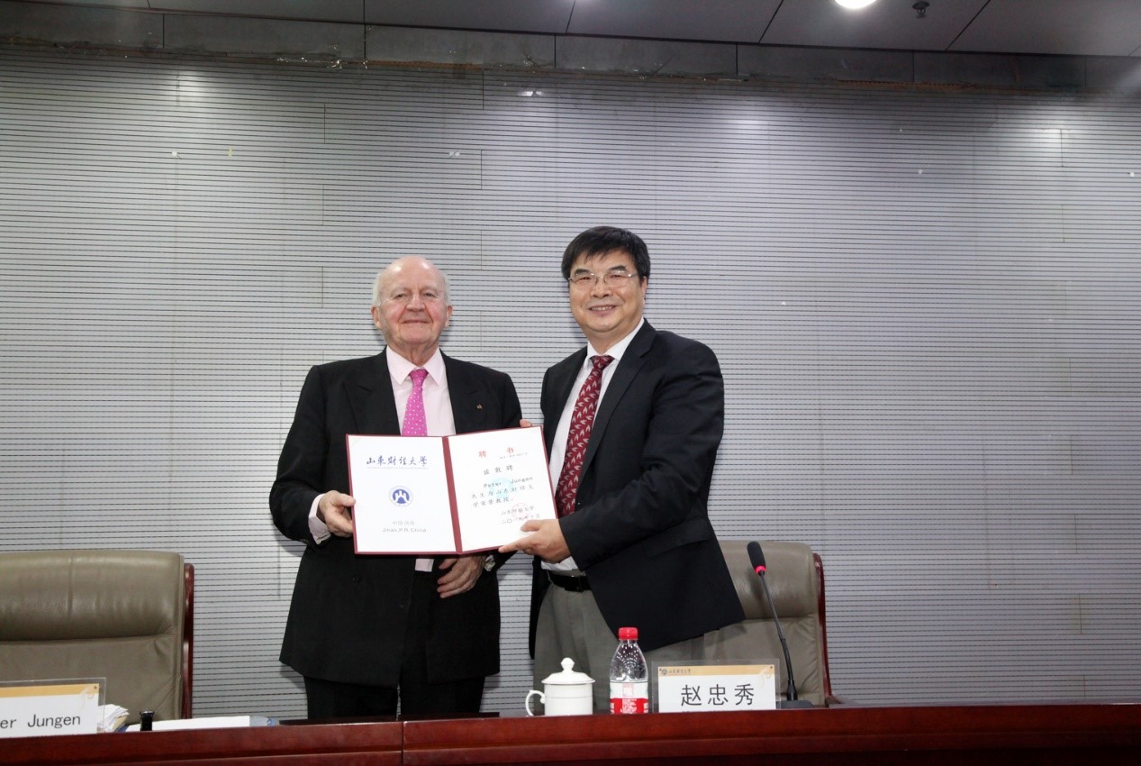 11月8日,应皇冠博彩 校长赵忠秀教授的邀请,德国天使投资联盟创始人兼总裁彼得•荣根(Peter Jungen)教授为我校师生作题为Development of China in the Last 50 Years的讲座,校长赵忠秀为彼得•荣根先生颁发荣誉教授证书并致辞。