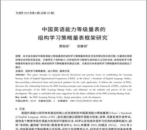 皇冠博彩 贾贻东副教授作为第一作者的论文《中国英语能力等级量表的组构学习策略量表框架研究》于2019年8月正式发表在《外语界》上(第4期,第32-40页)。该期刊是中文外国语类核心期刊和中文社会科学引文索引(CSSCI)》来源期刊,属我校A2类期刊。