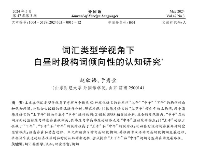我院于秀金教授(通讯作者)和研究生赵欣语同学合作的学术论文《词汇类型学视角下白昼时段构词倾向性的认知研究》在《外国语》2024年第3期发表。该刊在CSSCI“语言学(外国语文)”类期刊中位居第二,系我校A1类期刊。