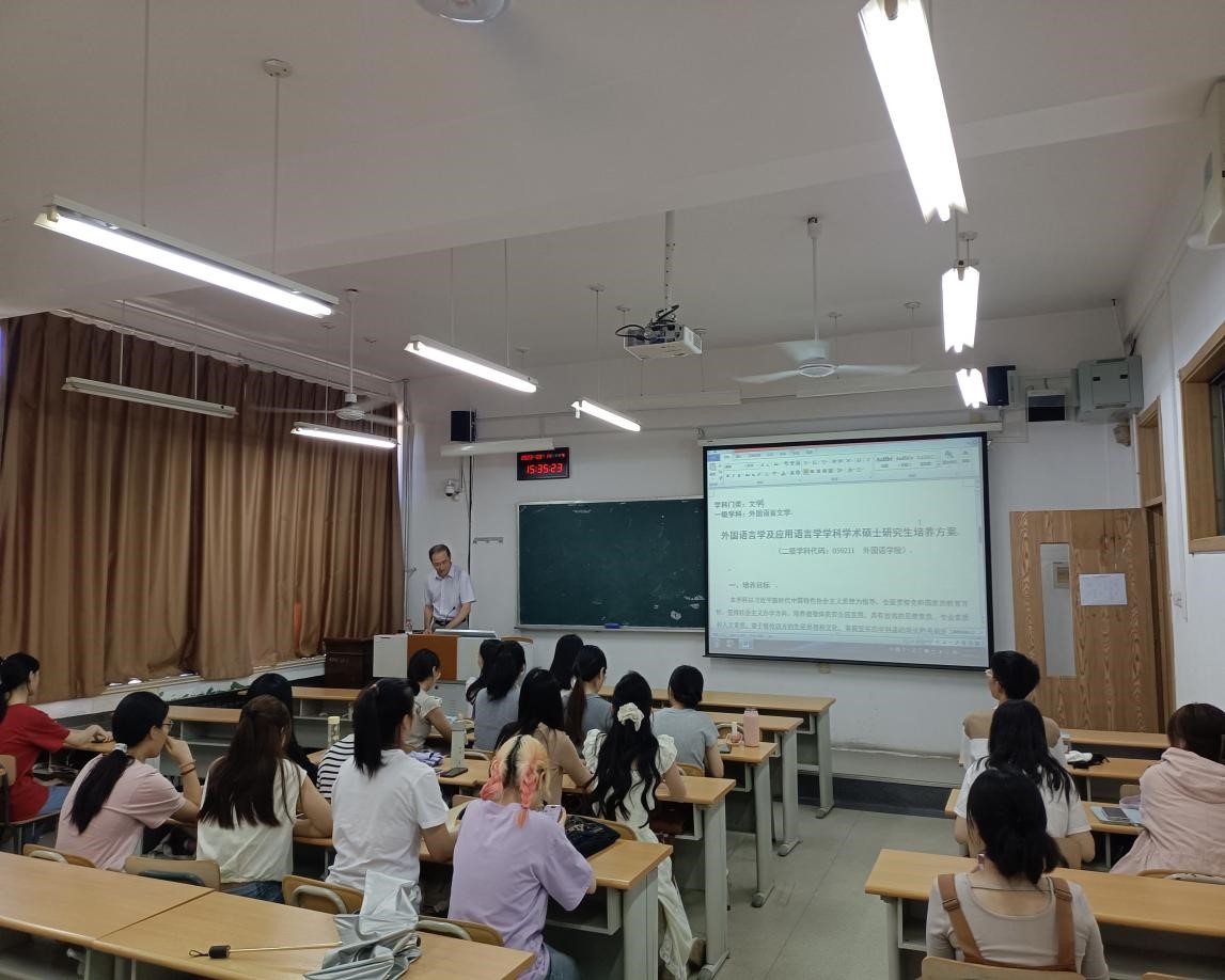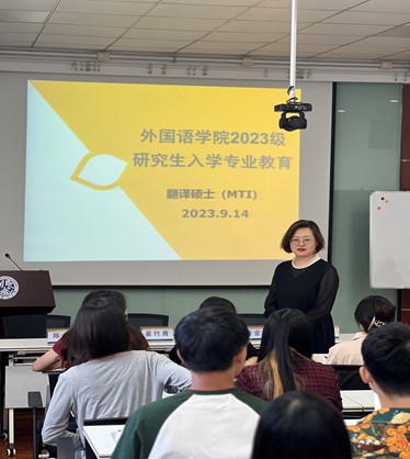 随后,学院根据专业方向分别对同学们召开了专业导学会。解玲针对翻译硕士介绍了语言服务行业的现状以及翻译行业当前机遇与挑战并存的时代背景、翻译专业培养目标和基本素质,随后重点讲解了教学培养过程中的翻译实践任务和专业实习任务。莫振银老师针对学硕型研究生讲解了专业学科计划、研究方向、培养计划、课程设置与考核等方面内容。