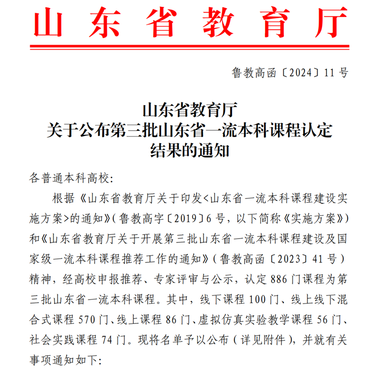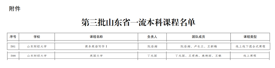 近日,山东省教育厅发布了《山东省教育厅关于公布第三批省级一流本科课程认定结果的通知》,我院申报的《英国文学》和《商务英语写作I》课程分别获批省级一流线上课程、省级一流线上线下混合式课程,同时被省教育厅推荐参加国家级课程申报。