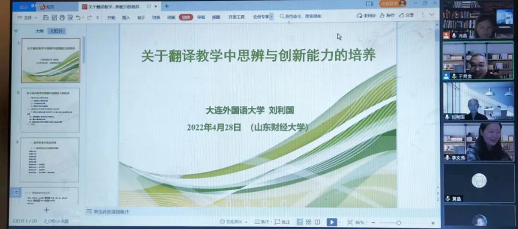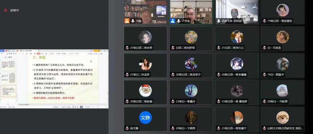 2022年4月28日晚,应皇冠博彩 邀请,大连外国语大学二级教授、教育部高等学校外国语言文学类教学指导委员会日语分委员会副主任委员刘利国教授线上作了题为“关于翻译教学中思辨与创新能力的培养”的学术报告。报告由皇冠博彩 院长于秀金教授主持,日语系全体教师和研究生、本科生共150余人参加了此次学术活动。