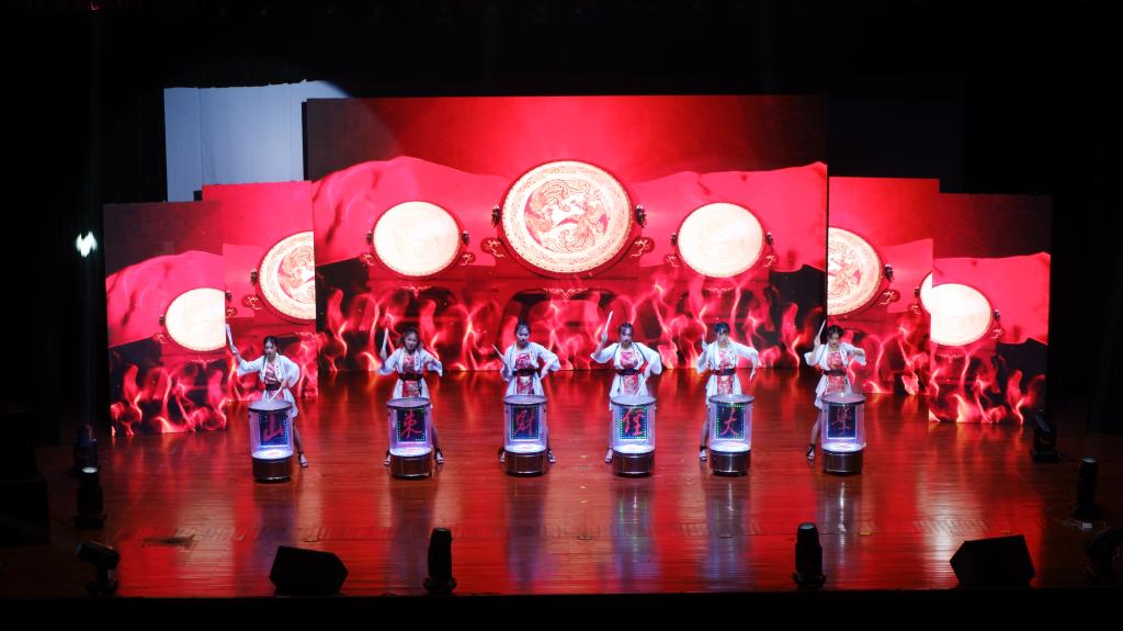 序幕拉开,灯光亮起,身着国风服饰的六位同学“踏鼓击春”。激扬、奔跃、骤止、翻腾,阵阵水鼓齐鸣和迸溅的水花将现场气氛点燃,正是青春的热情与力量一齐绽放的样子。在阵阵欢呼与掌声中,十位主持人迈向舞台中央,以中文、英语、法语、德语和日语等不同语种宣布此次文艺汇演暨表彰大会正式开始。
