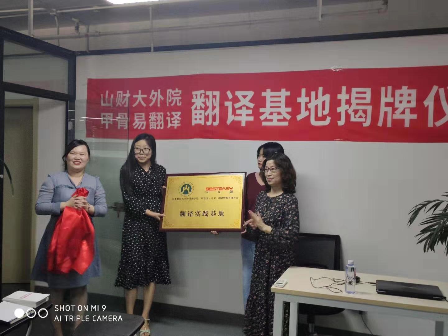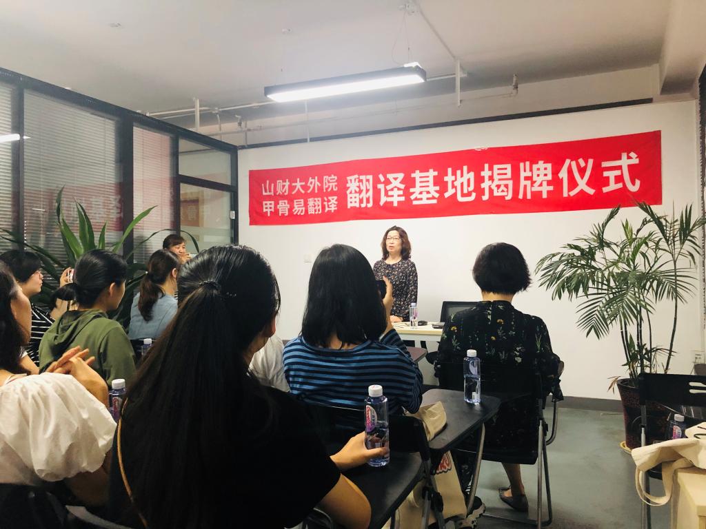 2019年9月26日下午,皇冠博彩 与甲骨易翻译基地揭牌仪式在甲骨易公司会议室举办。皇冠博彩 副院长史汝波教授,MTI教育中心主任解玲副教授,甲骨易(北京)翻译集团人资部张京秀总经理和济南分公司刘相真经理,我院部分2018级翻译硕士研究生与2019级全体翻译硕士研究生参加了本次揭牌仪式。