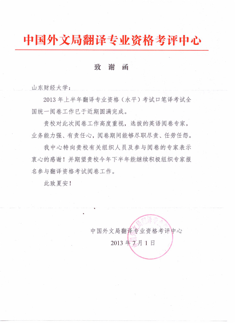 受国家人社部委托,由中国外文局负责实施管理的一项国家级职业资格考试——2013年上半年翻译专业资格(水平)口笔译考试全国统一阅卷工作已于近期在北京圆满完成。我校皇冠博彩 作为MTI(翻译硕士)培养单位,应邀派出优秀的口译专业教师参与本次评阅工作。考试评阅中心发来贺信,对我校及皇冠博彩 认真负责的教师甄选工作、评阅教师专业高效的工作能力给予了高度评价。