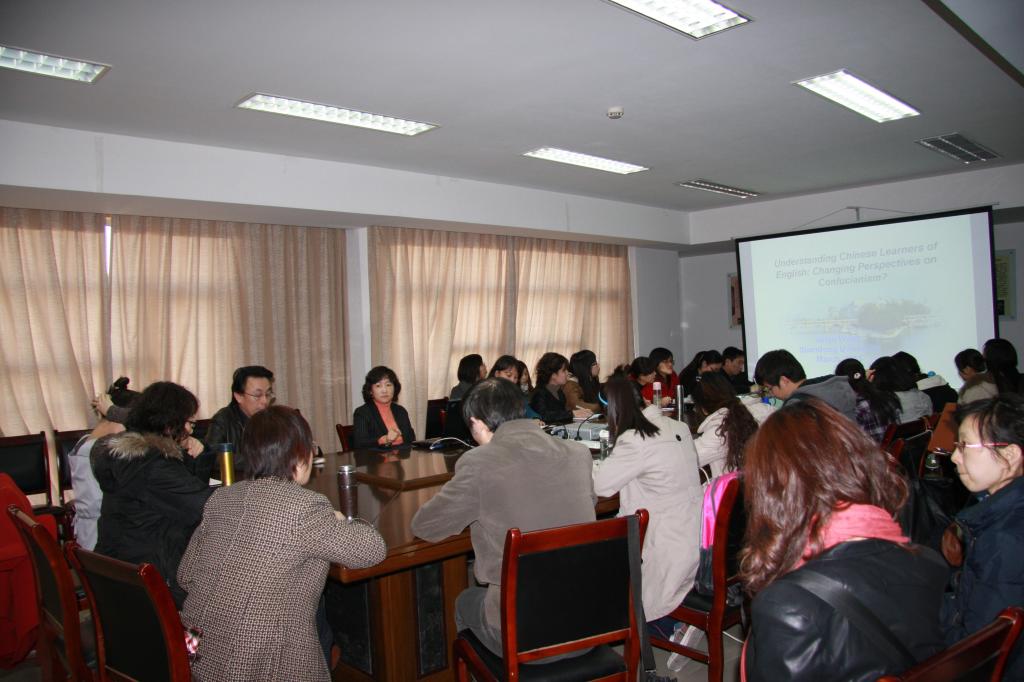 王俊菊教授围绕大儒家文化圈(CHC)展开讲座,首先回顾了传统儒家文化对中国教育理念的深远影响,接着以中国学生学习外语为视角,对儒家文化环境下的外语学习、外语教学、中国外语学习者的特征等进行了深入分析。王教授系统全面的统计分析表明:作为中国传统文化的内核,儒家思想中很多行之有效的教育理念,如“温故而知新”、“三人行必有我师”、“学而不思则惘,思而不学则怠”等在当代中国依然属于主流教育理念和学习理念,对外语学习者依然具有积极的启发和借鉴意义。但同时王教授也指出,中国外语学习者在对待传统儒家教育理念的态度上有矛盾和悖论之处,比如在积极认可儒家文化许多传统学习理念的同时,对儒家文化所倡导的学习目标持怀疑甚至否定态度;对教师作用的期望值越来越高,但对教师传统角色的反叛心理却越来越强。因此,我们应该以科学态度对待儒家文化对中国外语学习者的影响,古为今用,认真总结并批判继承这份思想和文化遗产,以期提高外语教学质量。