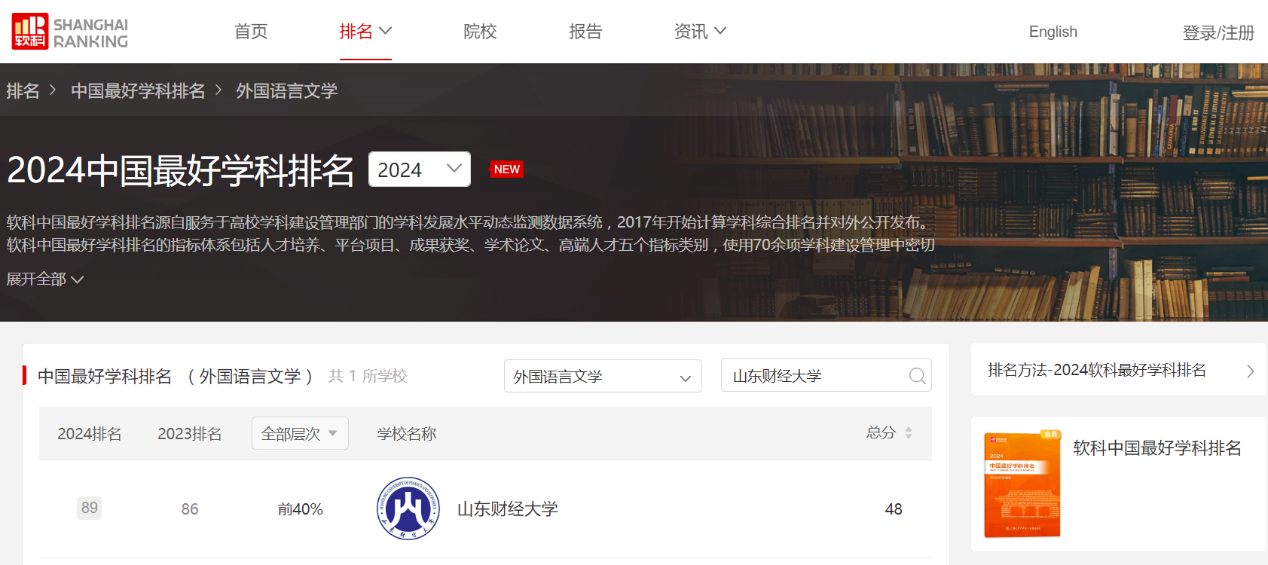 10月15日,高等教育评价专业机构软科正式发布“2024软科中国最好学科排名”,我院外国语言文学在榜单中位列全国第89位,山东省属高校第2位,名列全国高校前40%,自2017年以来,外国语言文学学科连续8年入选软科最好学科排名榜单。