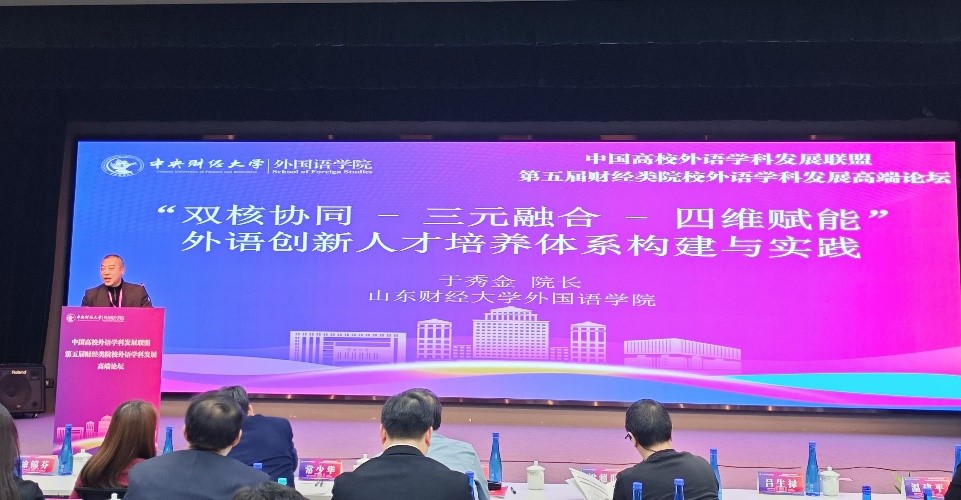 为贯彻落实党的二十届三中全会精神,主动对接国家战略对外语人才的需求,11月2日,由中国高校外语学科发展联盟财经类院校委员会主办,中央财经大学皇冠博彩 承办的中国高校外语学科发展联盟第五届财经类院校外语学科发展高端论坛在中央财经大学沙河校区举行,聚焦“新质生产力”背景下高质量商务英语人才培养的创新路径与发展主题。我院院长于秀金和院长助理阮岳湘、张斐瑞参加会议,于秀金在院长论坛环节作了报告。