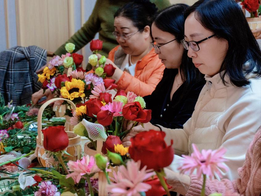 活动现场,茶香弥漫。老师们充分发挥巧思,将康乃馨、洋桔梗、玫瑰等花材巧妙搭配,一篮篮生机勃勃的作品逐渐成型。大家在花香与茶香中交流心得,共享温馨时光。