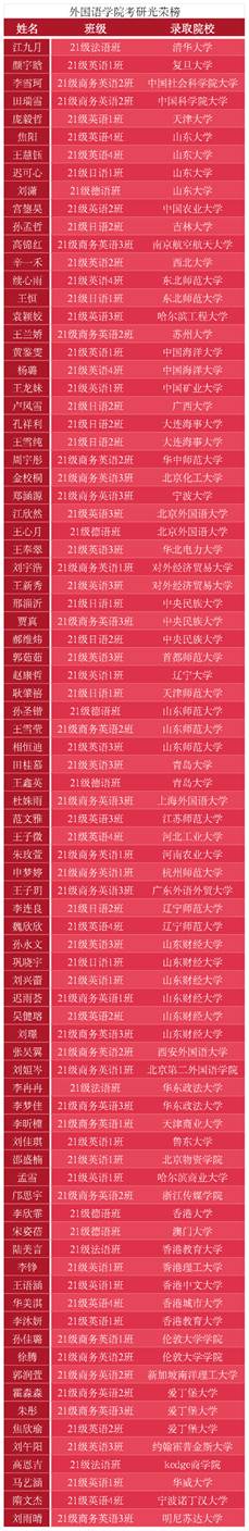 据统计,外院2021级253名学生中,168人报考研究生,报考率达66.4%,专业整体考研录取率继续保持新高。录取院校层次有新突破:清华大学、复旦大学、中国社会科学院大学、天津大学、山东大学、对外经济贸易大学等头部985、211学府以及语言类知名高校如北京外国语大学、上海外国大学、广东外语外贸大学、西安外国语大学等纷纷向外院学子抛出橄榄枝,充分体现了学子扎实的学术功底与实力。境外升学更添华彩,18名出国(境)学子中,10人跻身QS世界排名前60顶尖学府,被爱丁堡大学、伦敦大学、新加坡南洋理工大学、约翰霍普金斯大学、香港大学(中国)、香港中文大学(中国)等金融学、管理学、教育学、TESOL热门专业录取,彰显了“外语+”复合型人才的全球竞争力。