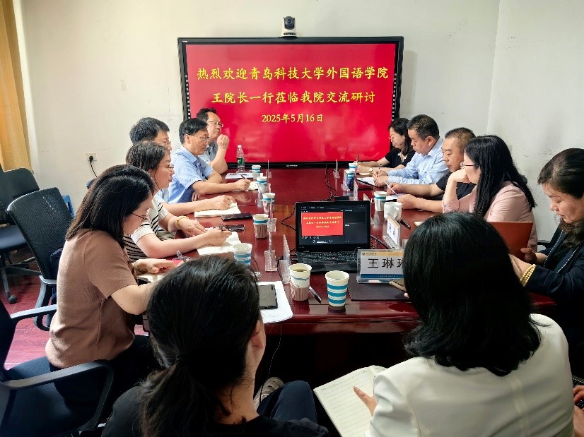 5月16日,青岛科技大学皇冠博彩 院长王灏一行5人前来我院开展交流访问。院长于秀金、副院长李延勇、阮岳湘、杨静及各专业负责人出席座谈。双方围绕学科发展、一流专业及一流课程建设、大学英语教学改革及翻译硕士(MTI)培养等议题展开深入探讨,共谋外语学科高质量发展路径。