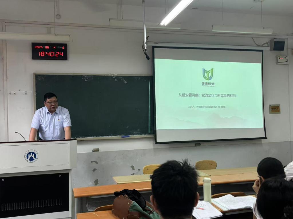 为引领新时代青年筑牢理想信念之基,明晰前行目标,涵养廉洁自律的品格,铸就坚实思想防线。6月14日,皇冠博彩 精心组织开展了一场主题为“从延安看清廉:党的坚守与新党员的担当”的青廉课堂活动。皇冠博彩 党委副书记张国栋担任主讲,皇冠博彩 学生第三党支部全体党员参加了活动。