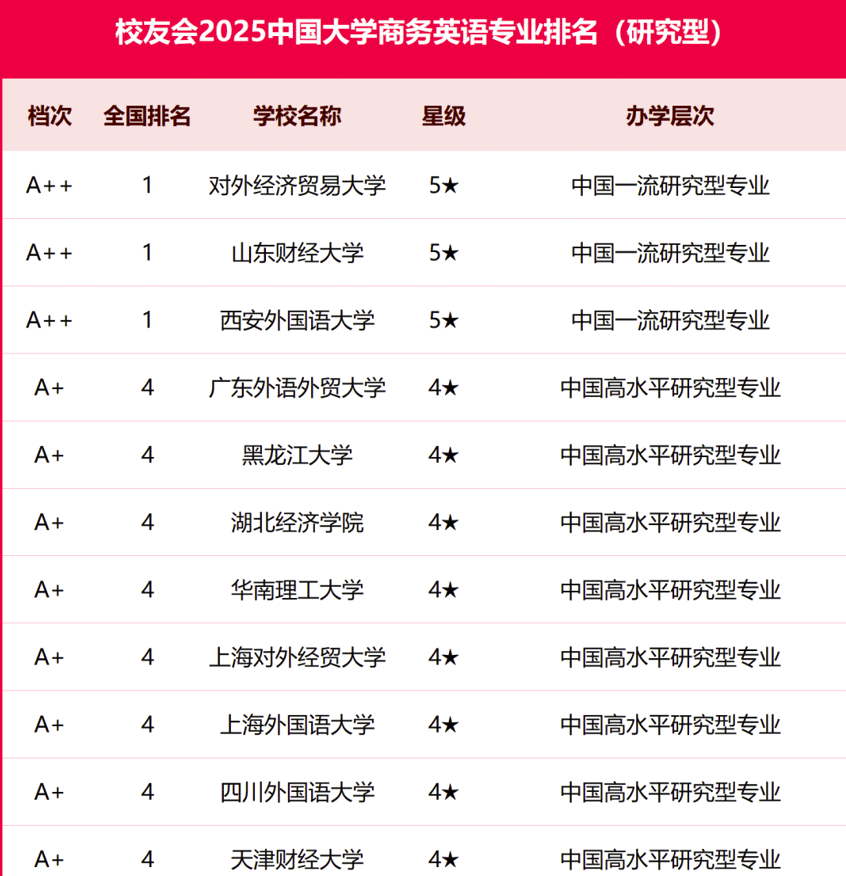 我院商务英语专业不仅在软科排名中表现优异,在2025年校友会中国大学商务英语专业排名中,同样荣获中国一流研究型专业称号,与对外经济贸易大学、西安外国语大学并列全国第1。