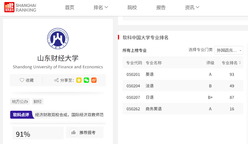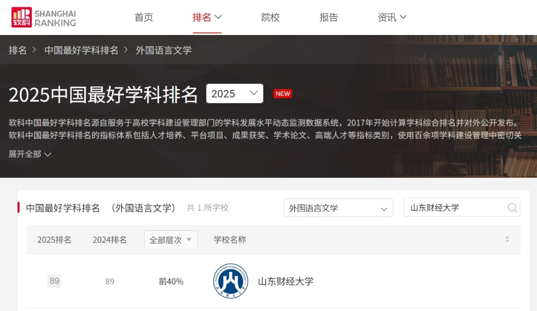 软科“中国最好学科排名”面向全国设有学术型研究生学位授权点的高校进行评价,涵盖人才培养、科研项目、成果获奖、学术论文、学术人才等5大类共17项指标。在本次排名中,我院外国语言文学学科从全国众多高校中脱颖而出,位列第89位,进入全国前40%行列,在全国财经类高校中排名第5位,展现了学院持续增强的学科竞争力。