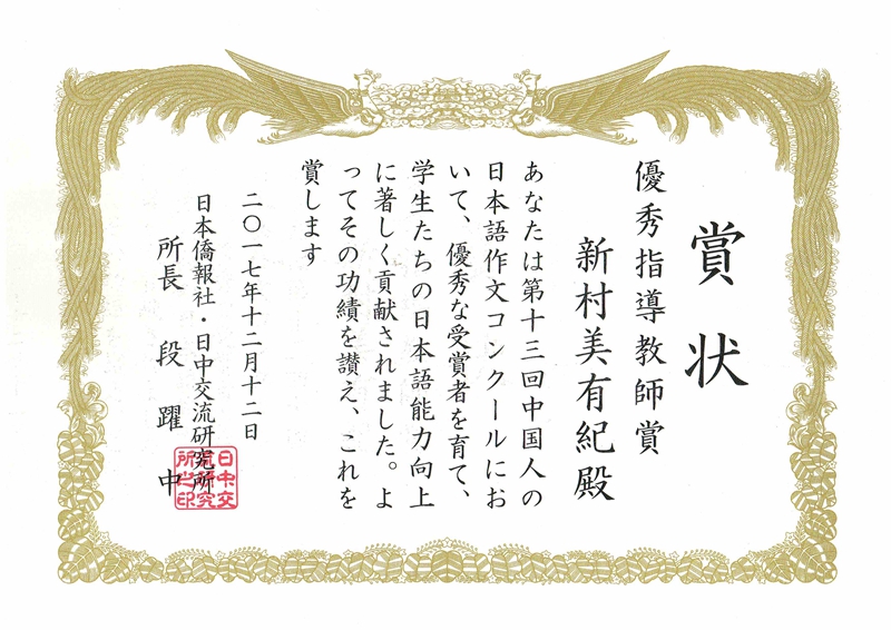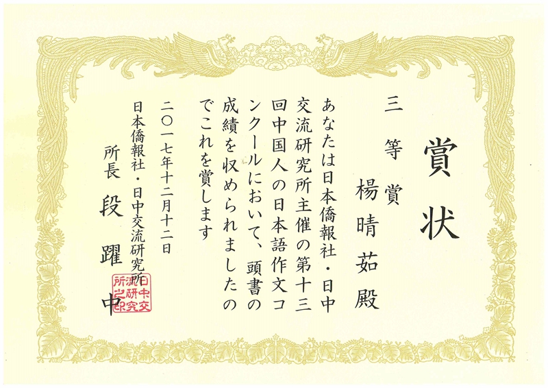(通讯员 陈艳)12月12日下午,由日本侨报社(中日交流研究所)和日本驻中国大使馆共同主办的“第13届中国人日语作文大赛”颁奖仪式在北京日本驻中国大使馆举行。日本驻中国大使横井裕、日本桥报社社长段跃中等为获奖者颁奖。我院2014级日语1班的杨晴茹荣获三等奖,外教新村美有纪获得优秀指导教师奖。