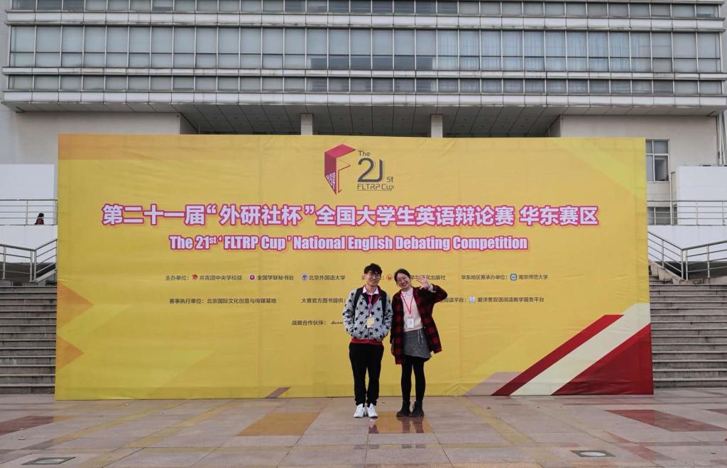 4月7日,第二十一届“外研社杯”全国大学生英语辩论赛华东赛区比赛在南京师范大学落幕。我院2015级英语四班姜锦望同学和2016级英语二班陆雯昕同学在华东赛区109支参赛队伍中脱颖而出,荣获华东赛区一等奖,成功晋级全国总决赛。我院教师李慧受邀担任赛场评委,并荣获优秀评委奖。