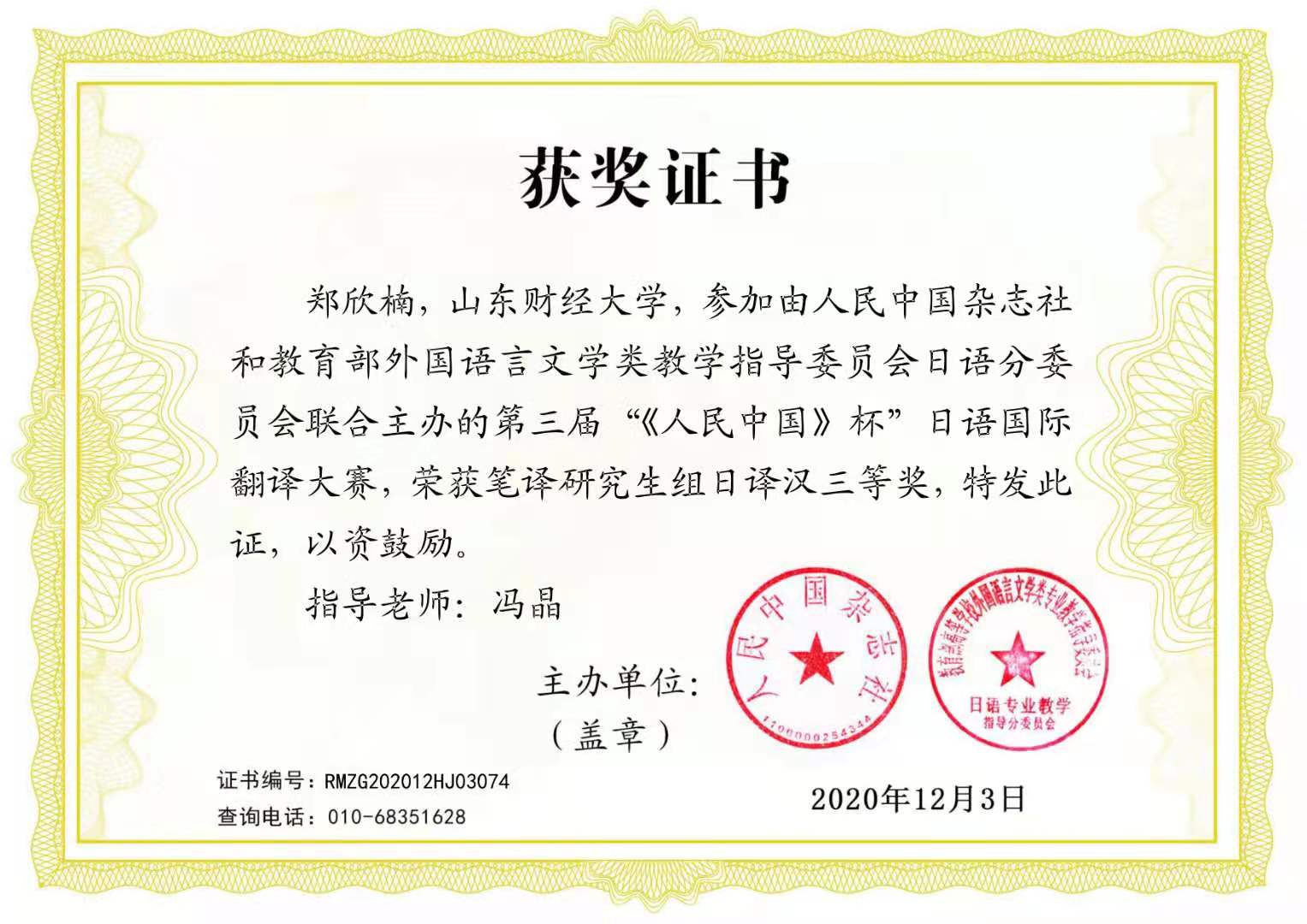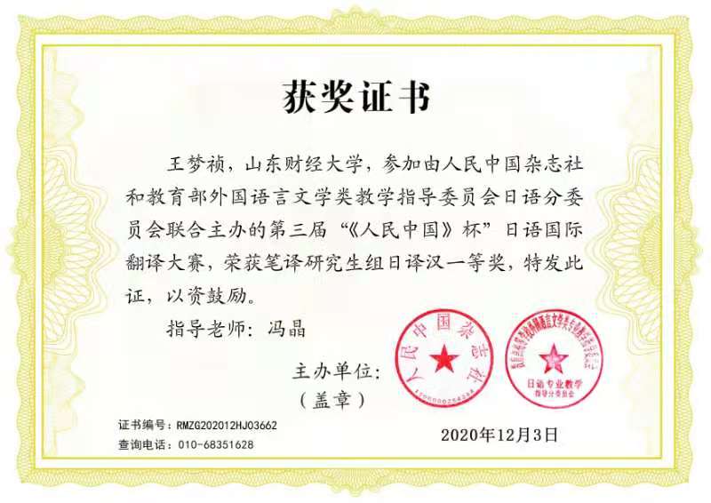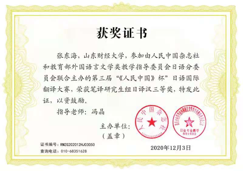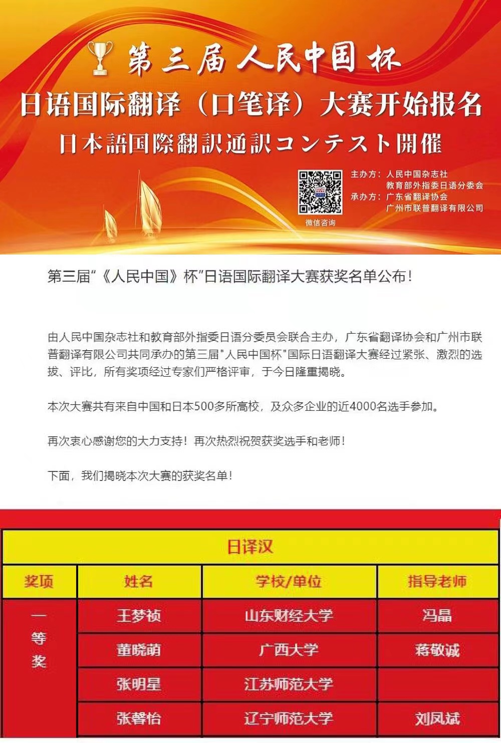 2020年11月27日,由中国外文局《人民中国》杂志社和教育部外指委日语分委员会联合主办的第三届“人民中国杯”日语国际翻译大赛的所有奖项隆重揭晓。在研究生组日译汉的比赛中,我院日语系4名研究生凭借出色的语言运用能力和过硬的翻译功底取得了优异成绩。其中,2020级研究生王梦祯荣获一等奖第一名,2020级研究生郑欣楠、张东海和2019级研究生郑盼盼同获三等奖(指导教师:冯晶)。