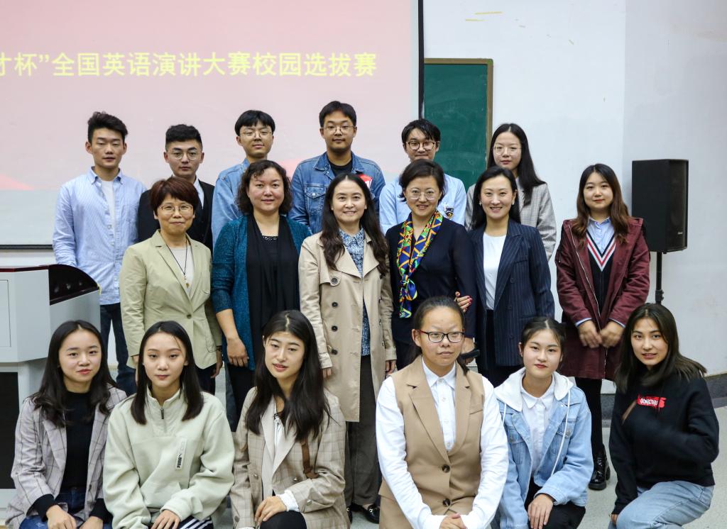 2019年10月11日下午,皇冠博彩 第六届外语技能系列大赛暨“外研社·国才杯”全国英语演讲大赛校园选拔赛在舜耕校区第二阶梯教室举行。高永红、马宏伟、王朋、解玲和张斐瑞五位老师担任评委,2018级英语专业于淑涵和2017级英语专业王哲娴担任主持人,皇冠博彩 各年级同学观摩了演讲比赛。